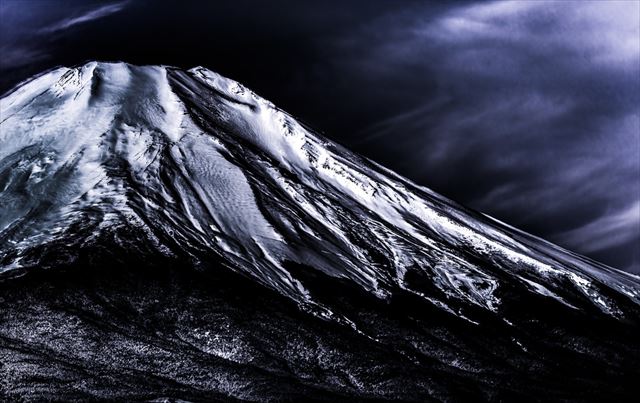 裾野がなだらかに広がる富士山も美しいですが、山頂付近に望遠レンズでグッと寄った富士山は、深く刻まれた谷が強さや荒々しさを感じさせてくれるダイナミックな姿を見せてくれます。雪の吹き付けた山肌と、低い位置から射す光が作る影がとても印象的なこの写真。コントラストの高いモノトーンの表現がより一層陰影を強調しています。カメラに内蔵されている特殊効果フィルターなどを使って、より印象深く富士山を表現してみるのも良いでしょう。