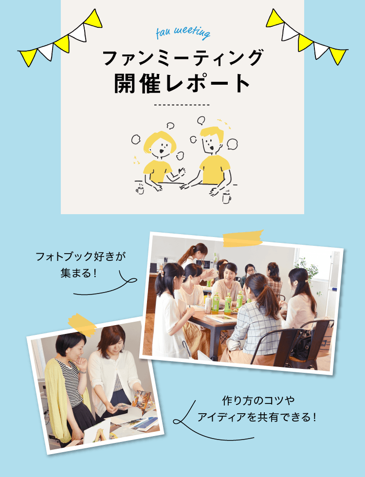 2019年5月30日に第10回ファンミーティングを開催しました!「旅行の度に作ってる!」「子どもの成長記録に年1冊」などたくさん作ってくださっている方や、「もうすぐ子どもが生まれるので、先輩ママさんのマイブックを見たい!」という方も。皆さま次回作へのヒントを見つけられたようです♪